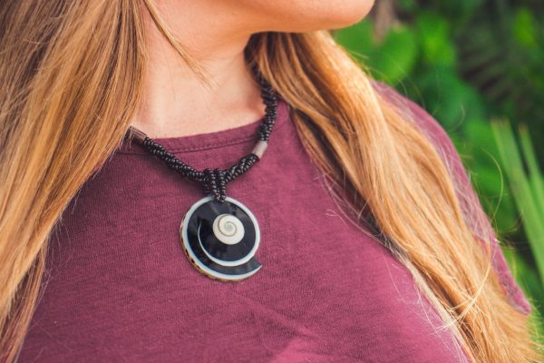 This necklace features the side-cut sections of the Cone shell set in black resin and a cochlea shaped shell set in the center. The shells are then taken to a high gloss polish to reveal their beatiful natural spider web pattern. The pendant is matched with a weave of attractive black seed beads to create this beautiful handmade necklace.